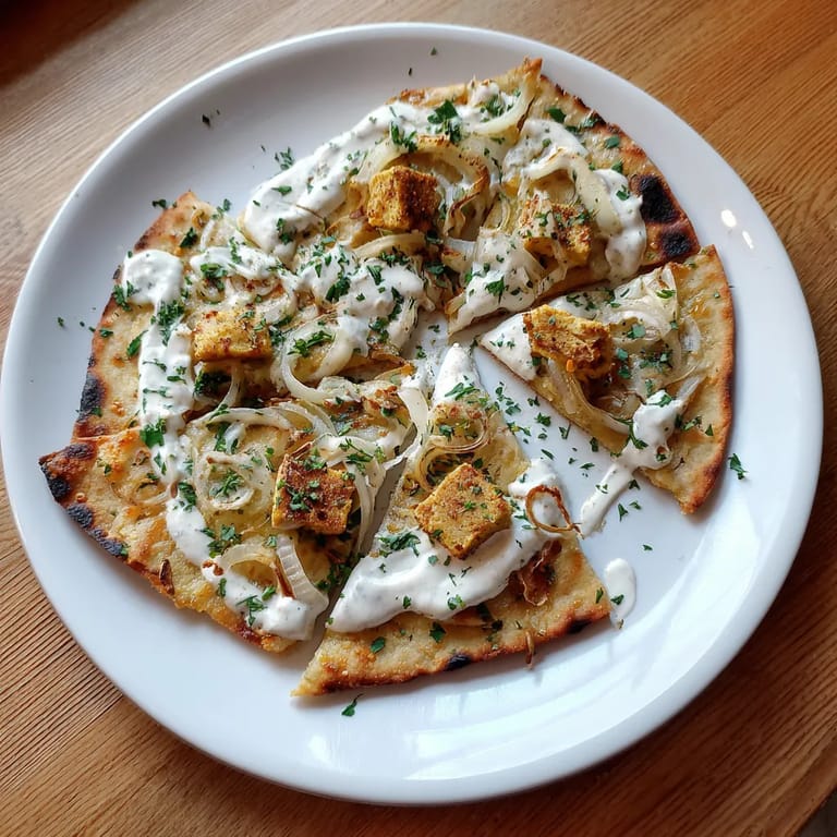 Ich habe diesen veganen Flammkuchen nach einem Elsassurlaub ausprobiert und seitdem macht ihn meine Schwester zu jedem Geburtstag. Wir alle schwören auf die Kombination aus rauchigem Tofu und frischer Creme.