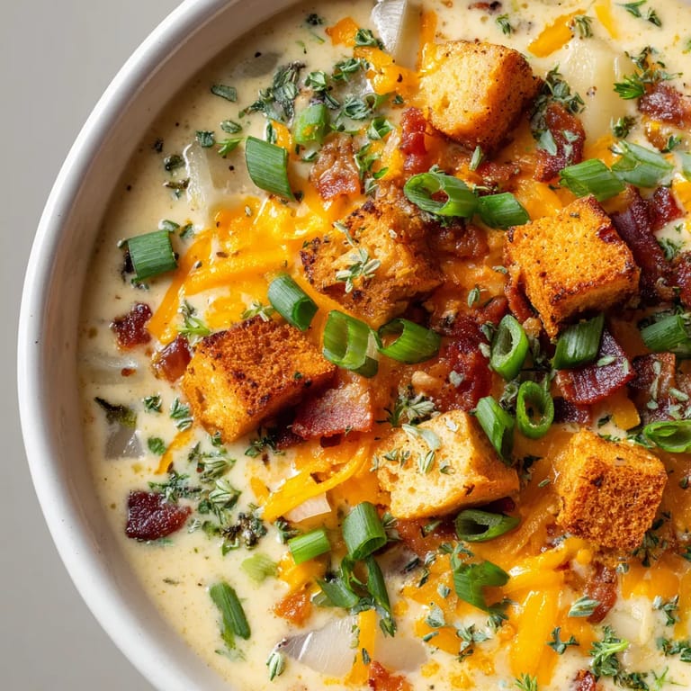 Diese cremige gebackene Kartoffelsuppe kombiniert ofenfrische Kartoffeln mit mildem Käse, zarten Lauchzwiebeln und knusprigen Toppings. Sanft gedünstete Zwiebeln und Knoblauch sorgen für ein harmonisches Aroma, während eine Mischung aus Sahne und Milch die typische Sämigkeit bringt. Abgerundet wird sie durch würziges Paprikapulver und frisch geriebene Muskatnuss, garniert nach Wahl mit Speckwürfeln oder Räuchertofu sowie extra Käse und frischer Petersilie. Perfekt als sättigendes Hauptgericht, am besten mit einer Scheibe ofenwarmem Brot genießen.