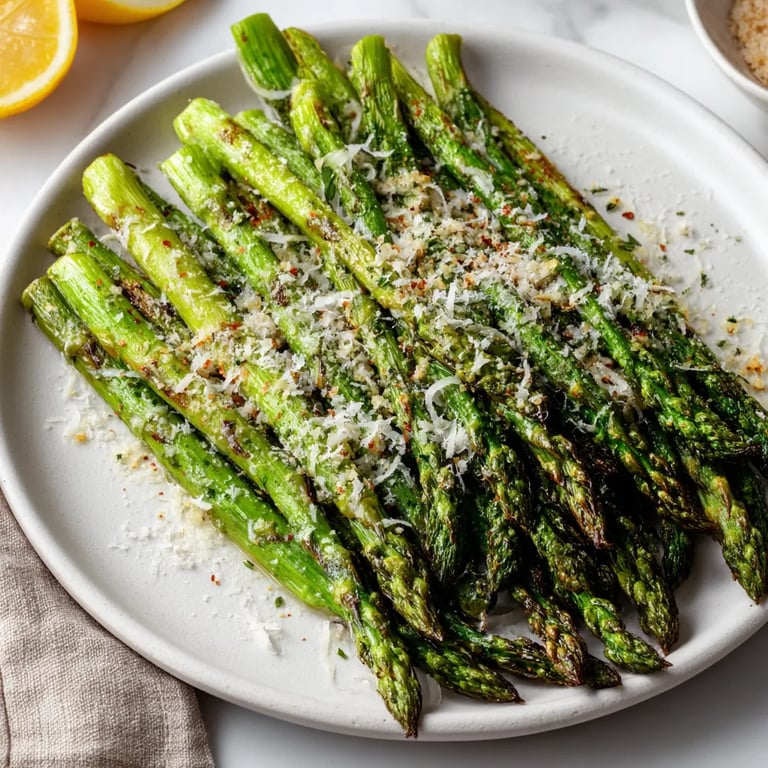 Zarter Spargel vom Grill mit Parmesan und zitronigem Dressing für frischen Genuss.