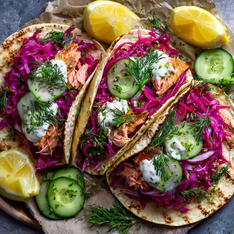 Merken Diese Smoked Trout Tacos verbinden zarte Räucherforelle mit würzigem, eingelegtem Rotkohl und einer cremigen Meerrettichsoße für einen spannenden Mix aus deutscher Aromatik und Streetfood-Feeling. Saftige Gurkenstreifen und frischer Dill runden das Zusammenspiel ab – perfekt, wenn es unkompliziert und dabei besonders lecker sein soll.