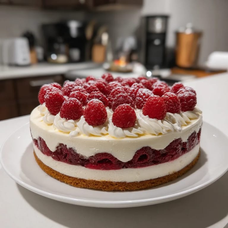 Eine leichte Torte mit Schichten aus reichhaltiger Sahne und säuerlichen Himbeeren, ideal für warme Sommertage.