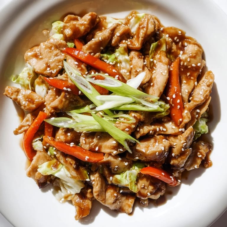 Dieses schnelle asiatisch inspirierte Gericht kombiniert zartes, in Scheiben geschnittenes Huhn mit knackigem Kohl, Karotten und Paprika in einer köstlichen umami-reichen Sauce.