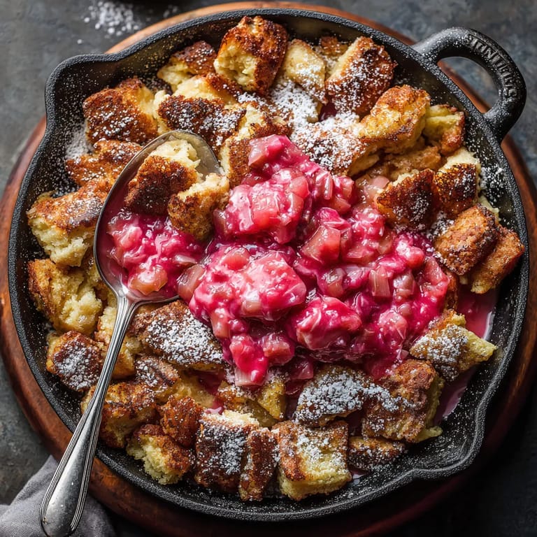 - Mit Puderzucker bestäuben und direkt mit dem lauwarmen Rhabarberkompott servieren, entweder alles in der Pfanne oder portionsweise auf Teller verteilen