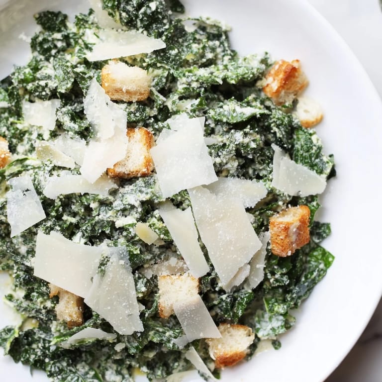 Merken I stumbled onto the magic of massaged kale completely by accident one Tuesday afternoon when I was too lazy to chop lettuce and needed a salad fast. My hands were already dirty from gardening, so I just rubbed the kale with olive oil right in the bowl, and suddenly it transformed from bitter and tough to buttery and sweet. That little discovery led me to create this Caesar version, and now I make it constantly because it feels like a small victory every single time I taste that creamy, garlicky dressing meeting those tender, emerald leaves.