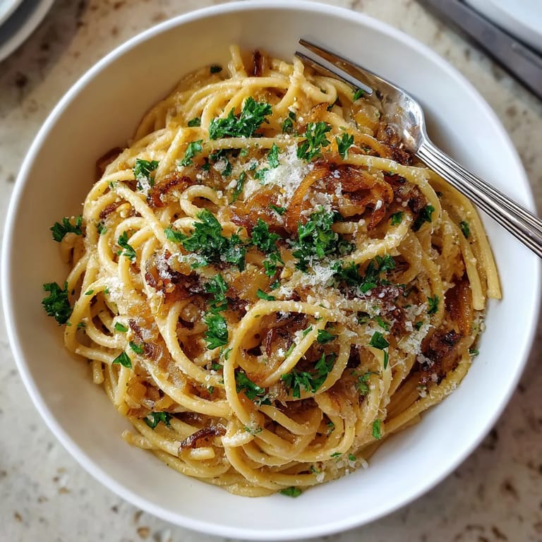 Merken Caramelized Onion One-Pan Pasta ist die perfekte Lösung für Abende, wenn man etwas Warmes und Tröstliches möchte, aber nur minimale Küchenarbeit anstrebt. Alles schmort zusammen in einer Pfanne, während süße Zwiebeln für ein überraschend tiefes Aroma sorgen und sich um jeden Pastastrang legen. Diese einfache Kombination aus wenigen Zutaten zeigt, wie beeindruckend unkompliziertes Kochen schmecken kann.