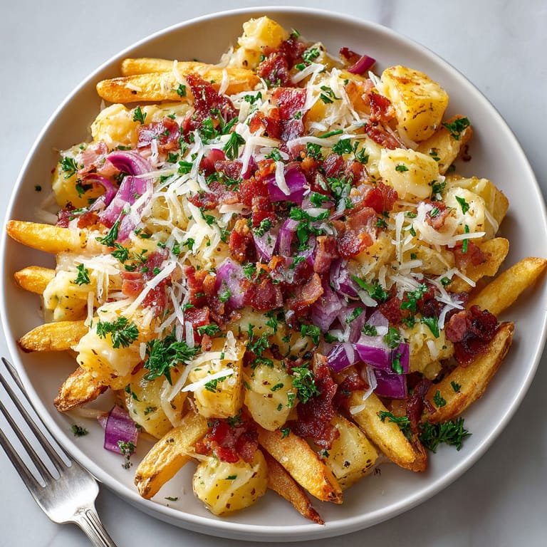 Merken Mit diesem Rezept verwandelst du klassische Pommes frites in ein herzhaftes Hauptgericht voller Wohlfühlaromen: Knusprige Pommes werden mit warmem Kartoffelsalat nach deutscher Art, würzigem Speck, zart schmelzendem Käse und frischen Kräutern belegt. Ein ideales Wohlfühlessen zum Teilen, das immer ein echter Publikumsliebling ist.