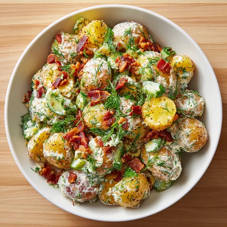 Merken Dieser knusprige Kartoffelsalat mit krossem Bacon und frischen Kräutern ist perfekt, wenn du nach einer besonderen Beilage suchst die Gäste immer zum Schwärmen bringt Er kombiniert ofengeröstete Kartoffeln mit einem cremigen Joghurt-Dressing knackigem Gemüse und extra viel Aroma durch Bacon und Kräuter