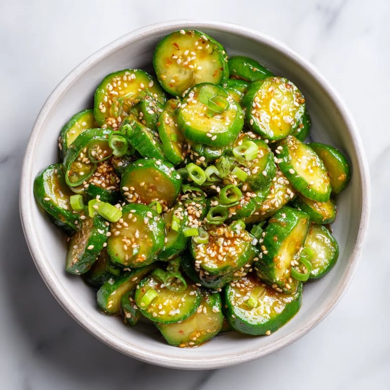 Kalorienarm viel Geschmack bei wenig Aufwand Passt zu vielen asiatischen und europäischen Gerichten Lässt sich je nach Saison pimpen zum Beispiel mit Radieschen oder Karotten Am liebsten mag ich den Salat mit extra viel Sesam und einer Spur mehr Chiliöl Wenn meine Familie zusammen draußen isst ist der Salat immer in Minuten als Erstes weg Er ist ein perfekter Einstieg zu hausgemachtem Bulgogi oder Bibimbap