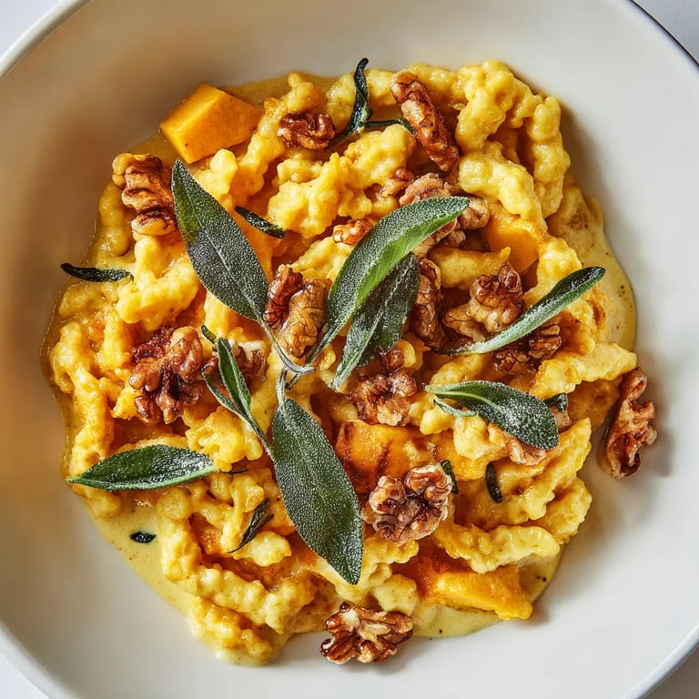 Spätzle stammen ursprünglich aus Schwaben und galten lange als Festessen In dieser Version bringt der Kürbis eine moderne Note herein während die gerösteten Walnüsse ein typisch französisches Herbstaroma zufügen Die Salbeibutter erinnert an italienische Einflüsse und macht das Gericht zu einer echten europäischen Fusion