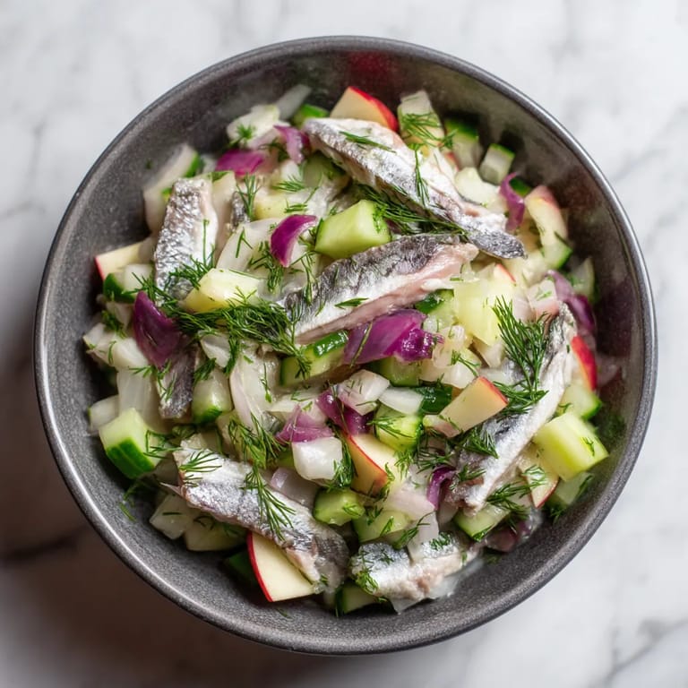 Merken Dieser köstliche Matjes-Hering-Salat mit Äpfeln und Dill ist eine perfekte Balance aus zarten Fischfilets, knackigen Äpfeln und aromatischem Dill. Das Rezept stammt aus meiner Familientradition und überzeugt durch seine erfrischende Leichtigkeit.