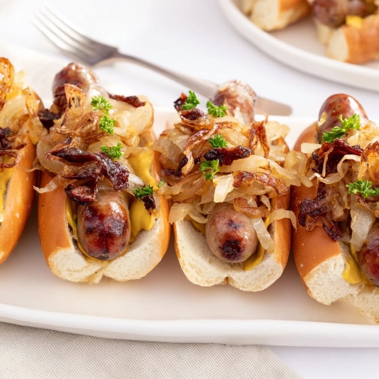 Merken Saftige Bratwurstwürstchen werden gegrillt und auf weichen Slider-Brötchen mit würzigem Senf, Sauerkraut und knusprigen Zwiebeln serviert—perfekt für Partys oder als herzhafter Snack.