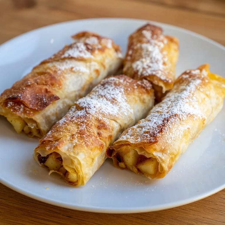 Diese knusprigen Apfelstrudel Rolls verbinden zarte, saftige Apfelstückchen mit süßen Rosinen und aromatischen Gewürzen wie Zimt und Muskat. Das hauchdünne Filoteigblatt wird mit Butter bestrichen, mit Apfelmischung gefüllt und sorgfältig zu einzelnen Rolls gerollt. Nach dem Backen erhält jede Rolle eine goldene, knusprige Kruste. Ideal als festliches Dessert oder süßer Snack, lassen sich die Rolls auch mit Vanilleeis oder Sahne servieren. Varianten mit Birnen oder getrockneten Cranberries regen zu kreativen Abwandlungen an, die leicht im Ofen aufgefrischt werden können.