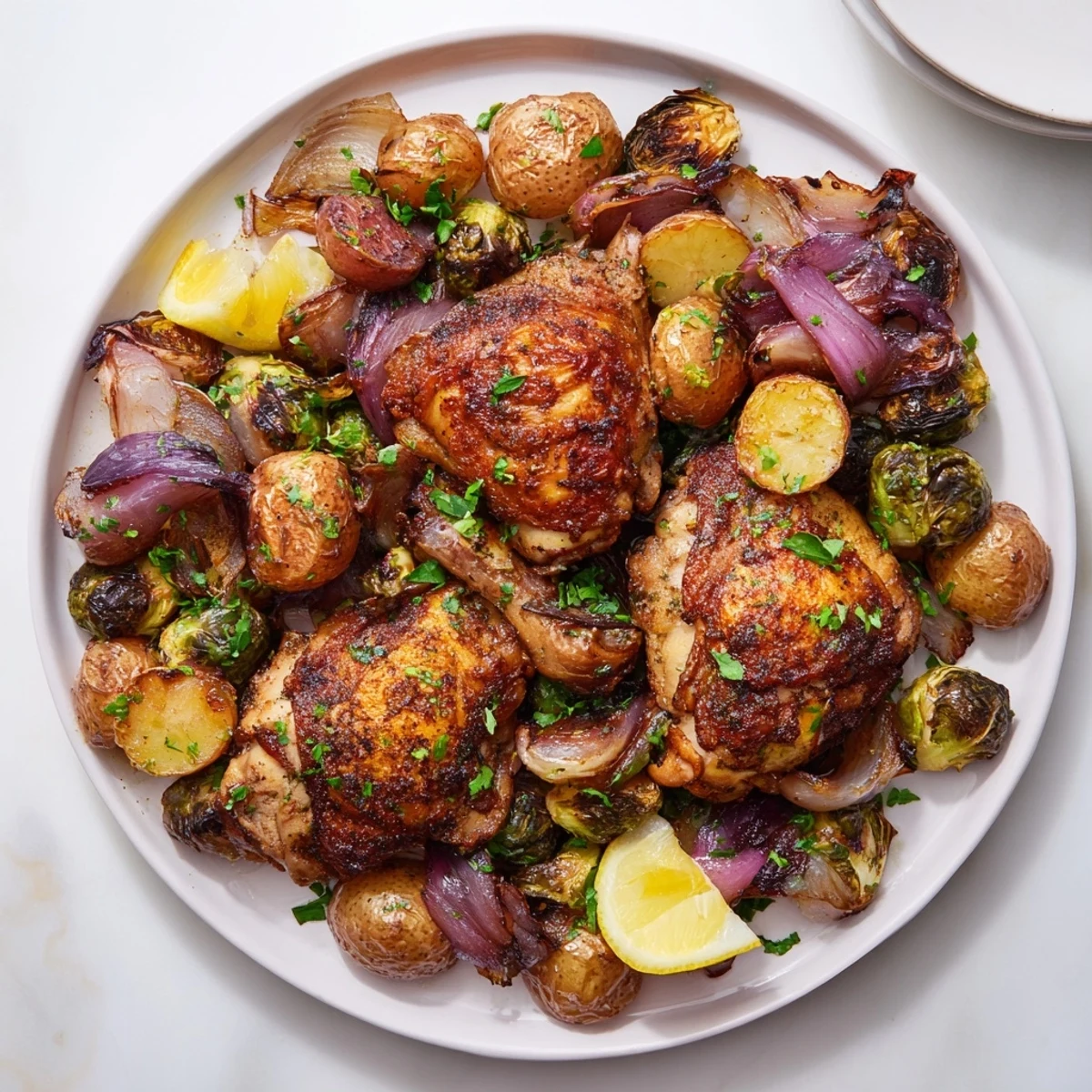 Merken Ein herzhaftes und aromatisches Gericht mit saftigem Brathähnchen, knusprigen Kartoffeln und karamellisierten Rosenkohl – alles zusammen auf einem Blech gebacken für einfache Reinigung.
