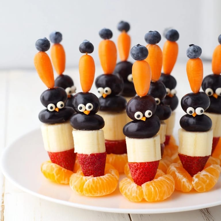 Merken Ein lustiger, gesunder und bunter Snack mit frischem Obst, das zu einer spielerischen Armee von Pinguinen arrangiert wird. Perfekt für Kinderpartys oder als kreative Leckerei für jeden Anlass.