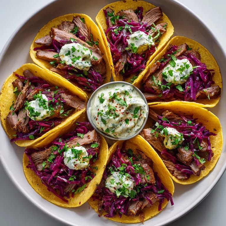 Merken Die klassischen Aromen der deutschen Rinderroulade kann man mit diesen Tacos in ganz neuer Form genießen. Würzige Rinderstreifen schmoren langsam im eigenen Saft, werden mit frischem Rotkohl-Slaw und einem cremigen Senf-Dip in Mini-Tortillas serviert. Das perfekte Fingerfood für alle, die Tradition und neue Ideen lieben.