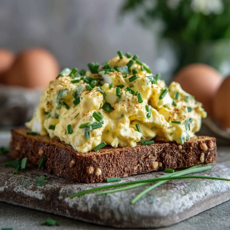Merken Dieses herzhafte Roggen-Sandwich mit cremigem Eiersalat ist mein Lieblings-Snack für beschäftigte Tage. Es vereint die kräftigen Aromen von Roggen mit der samtigen Textur von perfekt gekochten Eiern und der frischen Note von Schnittlauch.
