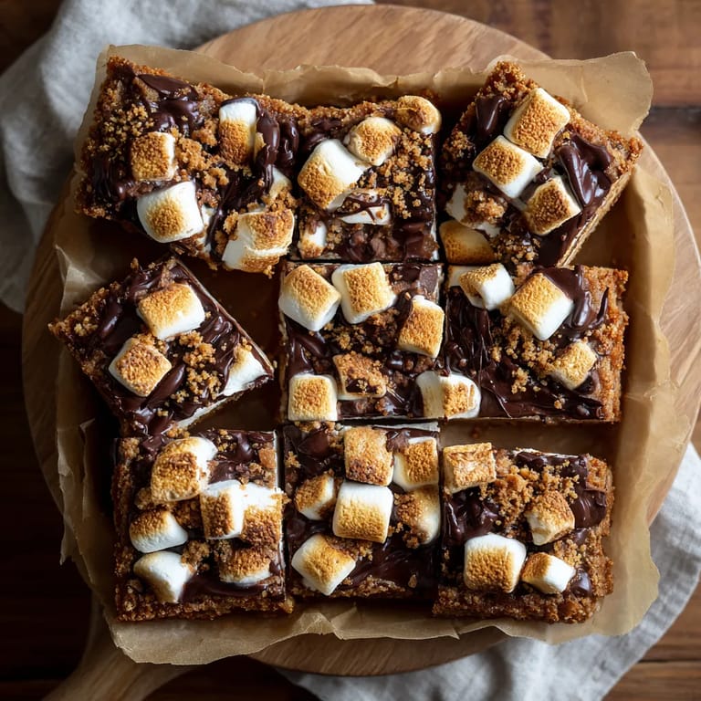 Diese S'mores Bars vereinen einen knusprigen Graham-Keksboden mit einer weichen Marshmallow-Schicht und zart schmelzender Schokolade. Die Herstellung gelingt ganz ohne Backen—einfach schichten, schmelzen, kühlen und in handliche Stücke schneiden. Ideal für spontane Naschmomente oder als süßes Highlight auf jeder Party. Kinderleicht und schnell zubereitet, liefert dieses Dessert herrlichen Genuss, ohne den Ofen zu benutzen.