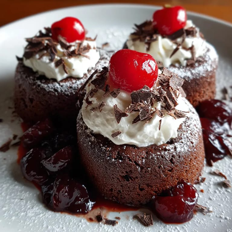 Merken Diese Black Forest Lava Cakes bringen den klassischen Schwarzwälder Kirschgenuss auf ein neues Level – mit einem warmen, flüssigen Schokoladenkern und einer fruchtigen Kirschfüllung. Jeder kleine Kuchen ist ein Fest für Genießer, besonders zu festlichen Anlässen oder wenn du einfach Lust auf einen außergewöhnlichen Nachtisch hast.