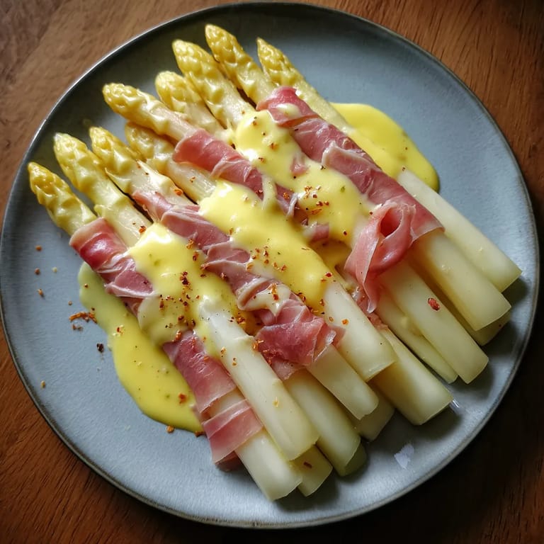 Weißer Spargel gilt in Deutschland und Frankreich seit Jahrhunderten als kulinarische Delikatesse. Im Gegensatz zum grünen Spargel wächst er vollständig unter der Erde, wodurch keine Photosynthese stattfindet und die charakteristische weiße Farbe erhalten bleibt. Die Kombination mit Hollandaise Sauce hat ihren Ursprung in der französischen Küche des 19. Jahrhunderts. Damals war dieses Gericht ausschließlich dem Adel und wohlhabenden Bürgern vorbehalten. Heute ist es ein beliebtes Frühlingsessen, das die Spargelzeit zwischen April und Juni feiert. In deutschen Restaurants wird es oft als "Stangenspargel mit Hollandaise und Schinken" auf den Speisekarten geführt.