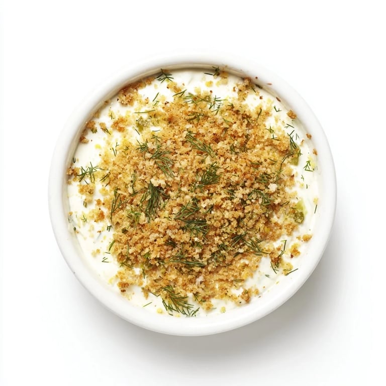 Panko-Brösel werden in Butter mit Paprika und Knoblauch leicht angeröstet und anschließend mit frischem Dill vermischt, bevor sie auf den Dip gestreut und gebacken werden.