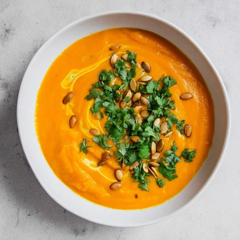 Diese cremige Suppe vereint die natürliche Süße von gerösteten Karotten und Süßkartoffeln. Mit Kümmel, Koriander und Ingwer fein abgestimmt, bietet sie einen wärmenden Genuss. Die Zugabe von Kokosmilch macht die Konsistenz besonders cremig. Ideal für schnelle Zubereitung, eignet sich die Suppe hervorragend für gemütliche Winterabende und lässt sich mit frischen Kräutern sowie gerösteten Kürbiskernen verfeinern.