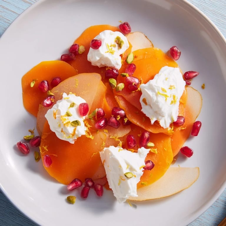 Merken Ein optisch beeindruckendes, erfrischendes Winterdessert mit süßen Kakis und saftigen Birnen, umhüllt von einer leichten, schneebedeckten Mascarponecreme, garniert mit Granatapfelkernen und Pistazien.