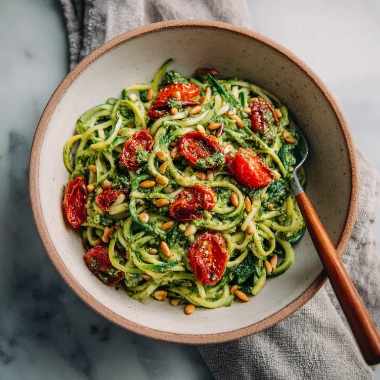 Zucchini-Nudeln oder Zoodles sind in der modernen Low-Carb-Küche sehr beliebt und stammen ursprünglich aus den USA, wo sie eine gesunde Pasta-Alternative bieten. Das Gericht lässt sich je nach Saison abwandeln – im Frühling passen grüne Erbsen, im Herbst geröstete Kürbisstücke. Pesto wird in Italien traditionell frisch im Mörser zubereitet. Der Geschmack ist dann besonders intensiv.